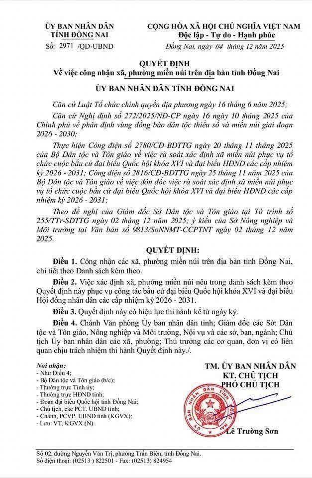UBND tỉnh Đồng Nai vừa ban hành Quyết định số 2971/QĐ-UBND ngày 04/12/2025 về việc công nhận xã, phường miền núi trên địa bàn tỉnh Đồng Nai.Theo đó có 11/95 xã, phường trên địa bàn tỉnh Đồng Nai được...