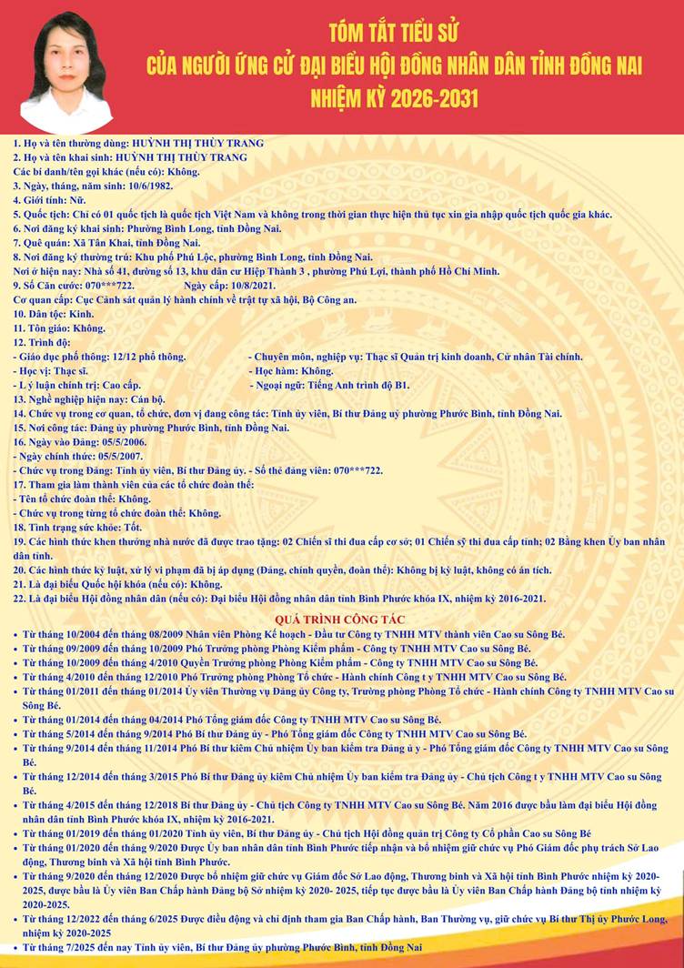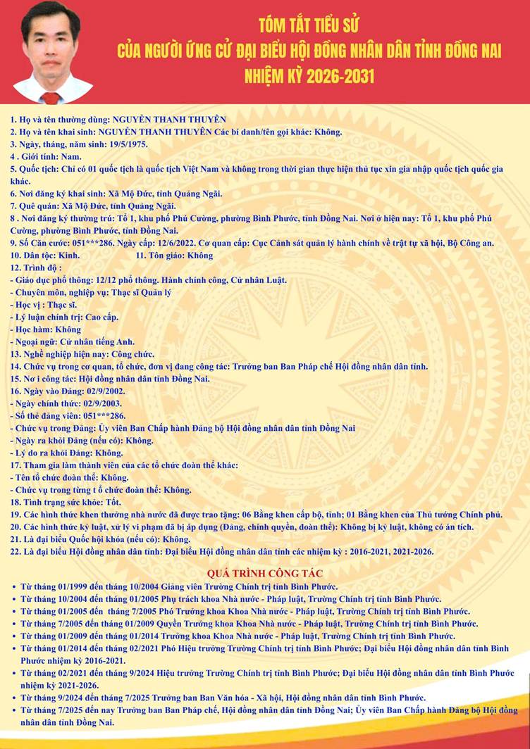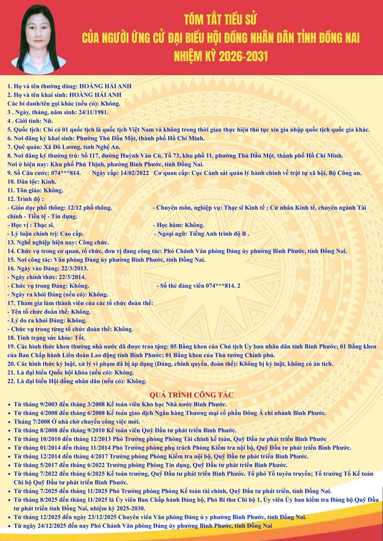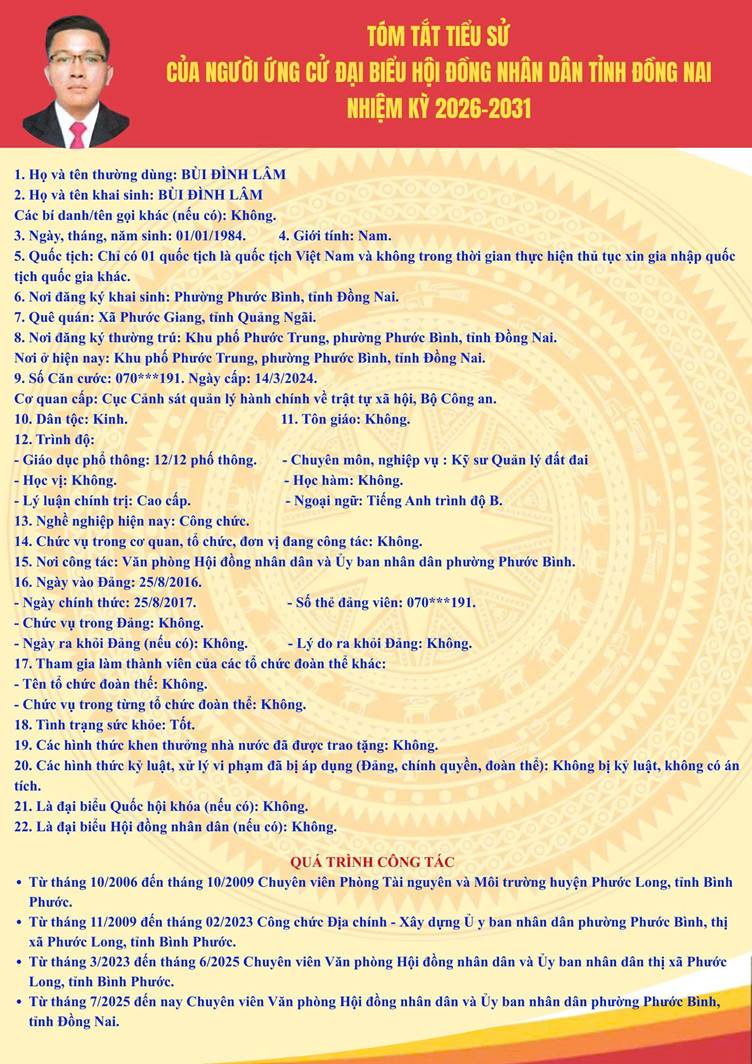Tiểu sử tóm tắt người ứng cử Đại biểu HĐND tỉnh Đồng Nai nhiệm kỳ 2026 - 2031