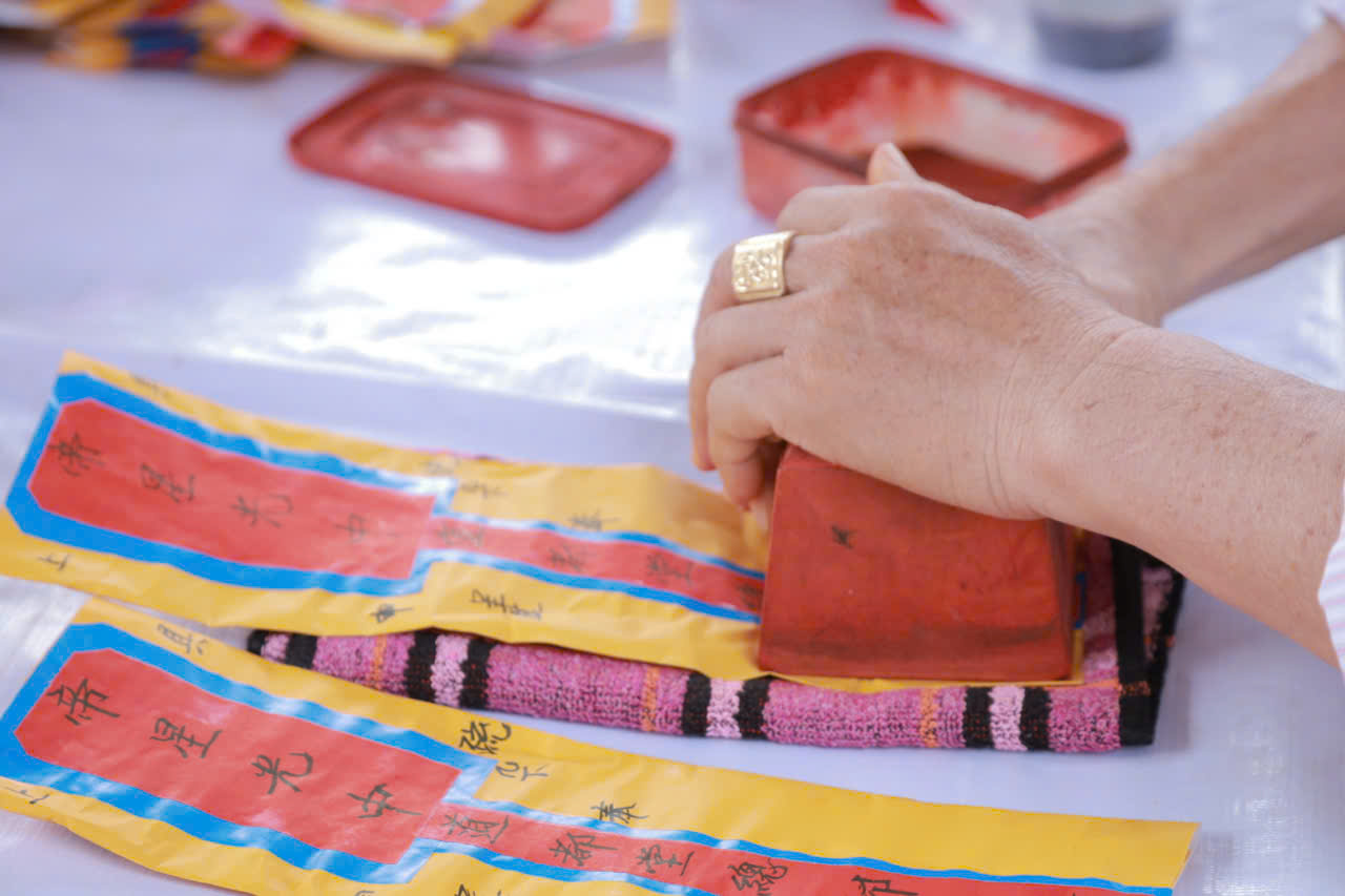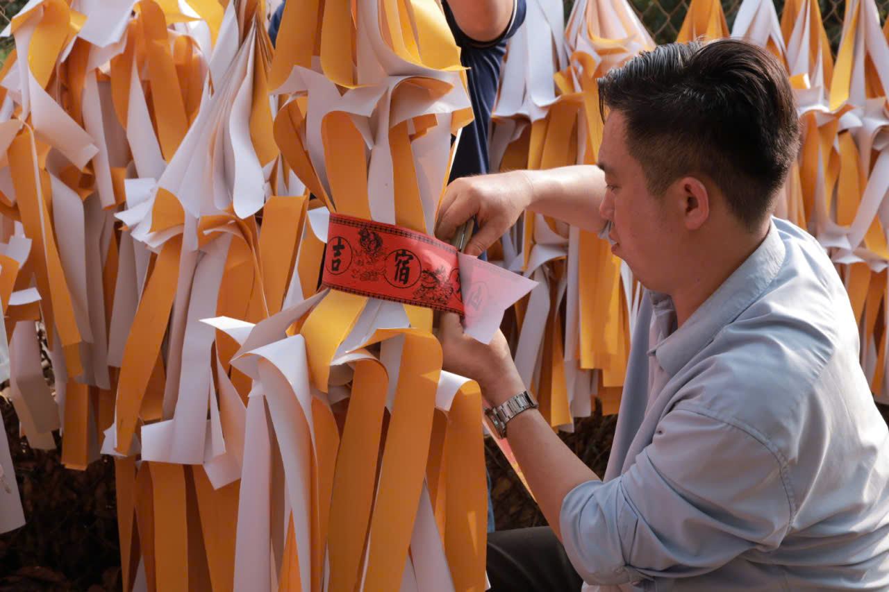 Vào mỗi dịp cúng đầu năm, người Hoa cũng giống như người Việt người Hoa cùng nhau lau don, vệ snh miếu thần tài sạch sẽ, sơn phết, dán giấy đỏ có chứ nhũ vùng hoặc vẽ bùa chú… để trấn uế tà ma, tẩy trừ xui xẻo cầu bình an. Những câu liễn đối được dán trong nhà với những câu thành ngữ chúc tụng như: “Xuất gia bình an” (dán trước cửa), “Cung chúc tân niên”, “Kim ngọc mãn đường”, “Khai trương hồng phát” (đối với những gia đình buôn bán).